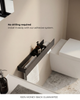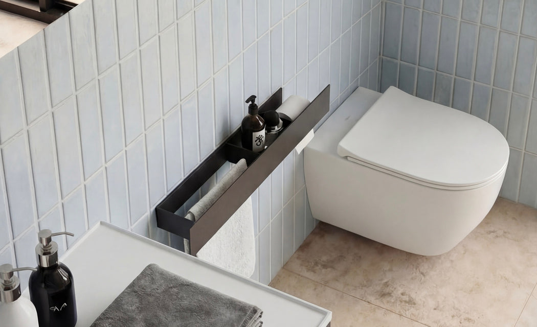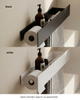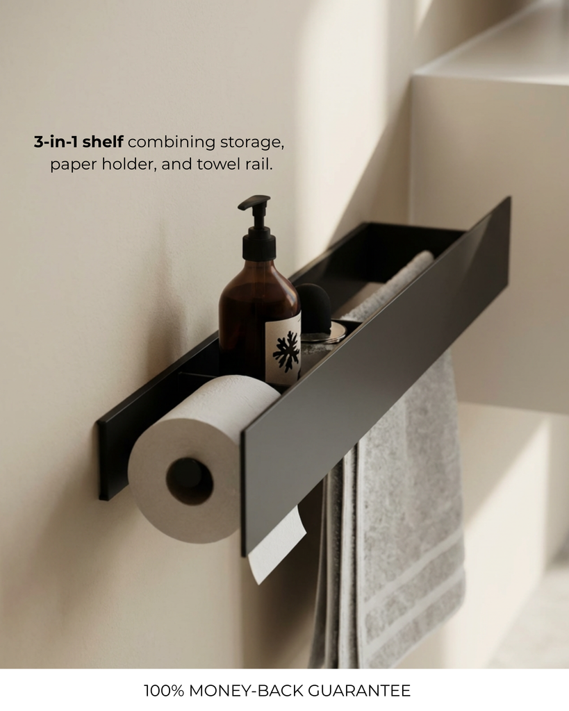 Three essential bathroom functions combined into one smart solution: toilet paper holder, storage shelf, and towel rail designed to optimize space without sacrificing style or functionality.